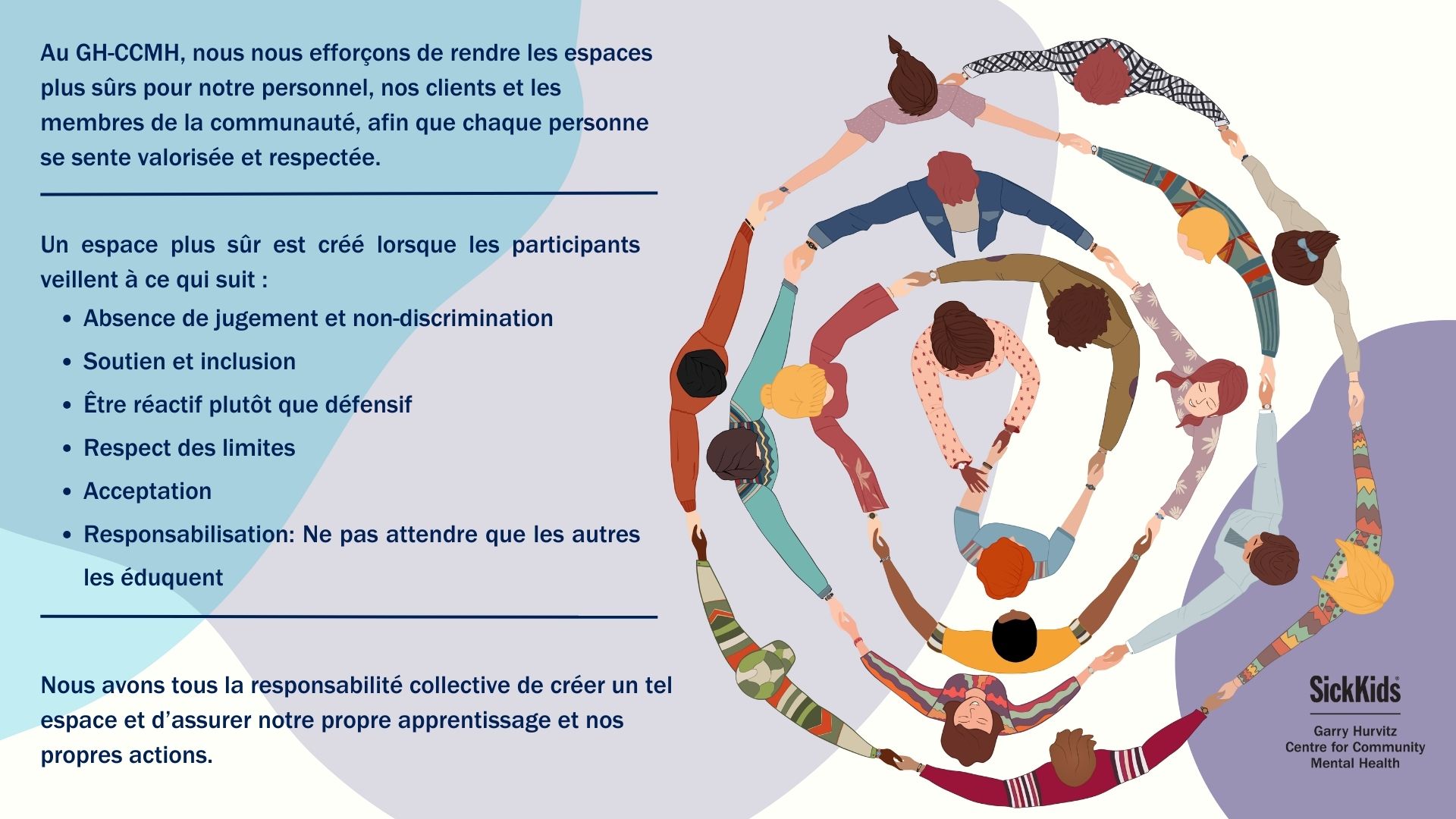 À GH-CCMH, nous nous efforçons de créer des espaces dans lesquels chaque personne est envoyée valorisée et respectée. Nous savons qu'un espace ne peut pas être sûr pour tout le monde, étant donné les systèmes de pouvoir et de privilèges qui existent dans notre société et qui conduisent à la marginalisation d'individus et de communautés spécifiques. Nous voulons en prendre acte tout en continuant à travailler pour rendre les espaces plus pour notre personnel, nos sûrs clients et les membres de la communauté.